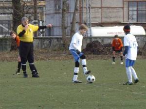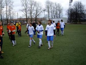 Spēle starp 96/95 gada komandām iesākās diezgan vienlīdzīgi. Vairāki uzbrukumi, labas situācijas un diezgan daudz kļūdu gan vienai gan otrai komandai. Līdz pirmā puslaika vidū ar ļoti skaistu un precīzu sitienu, pretinieku vārtsargu pārspēja